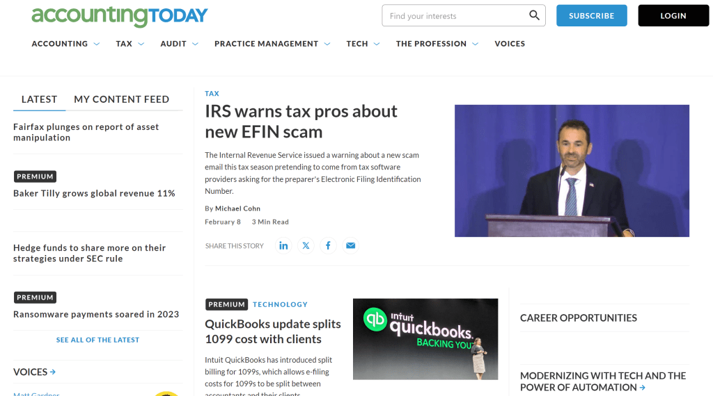 1. Pretty much every topic related to accounting can be found at Accounting Today. This is the best-kept secret of the practicing CPA’s toolbox. Certain to make you a more informed accountant, this website covers everything from accounting, tax, audit, practice management, to the overall profession. An online subscription runs $209 per year.